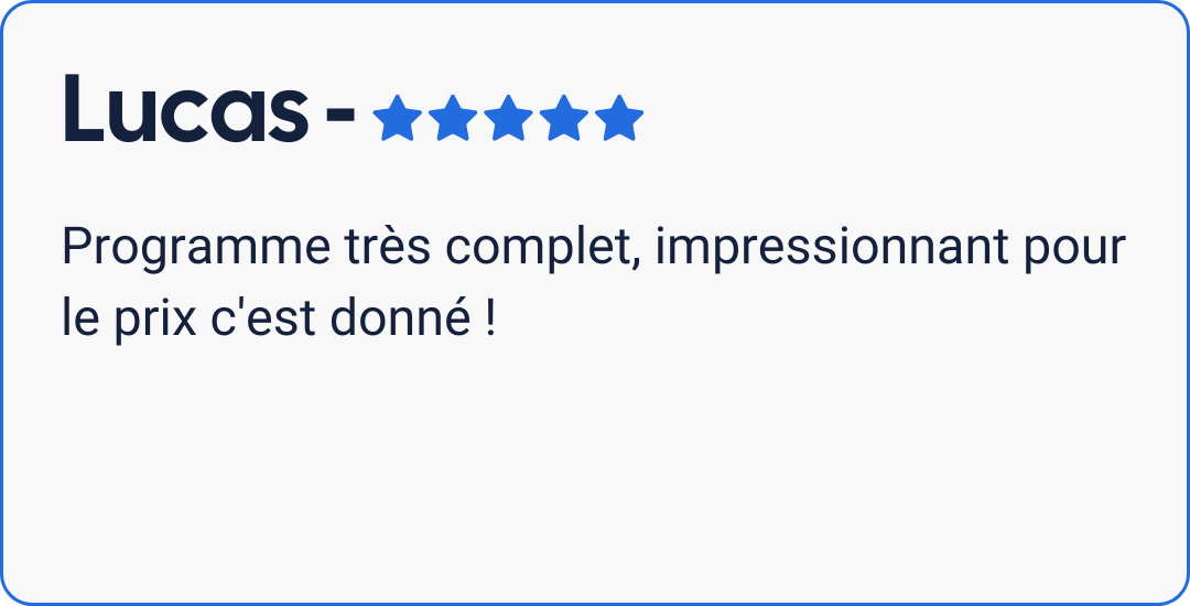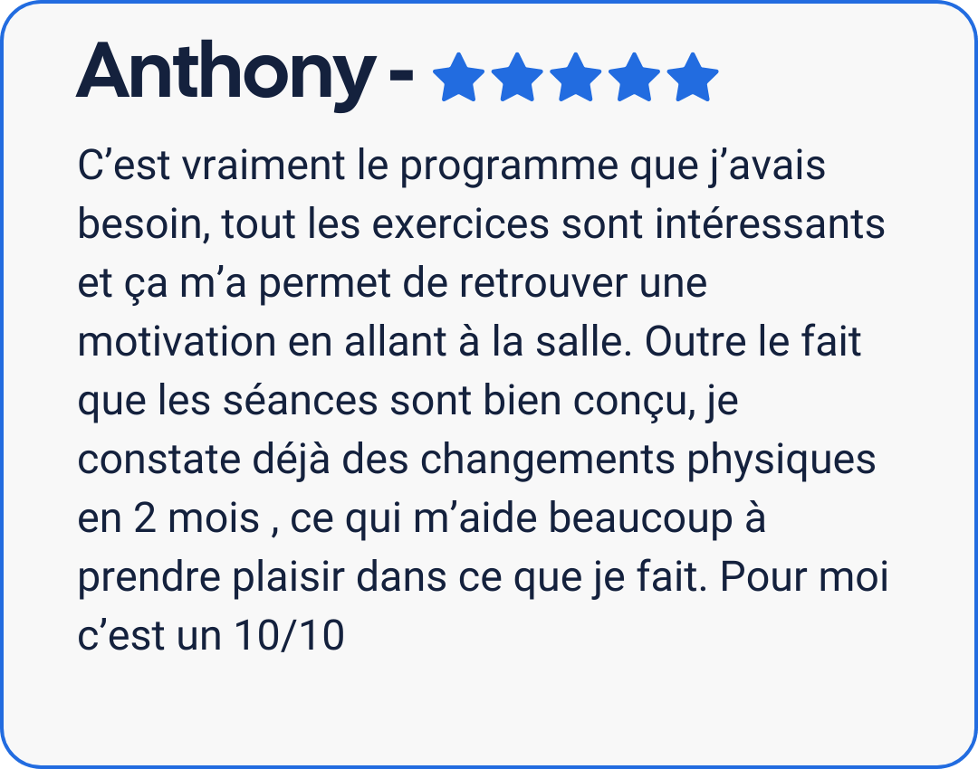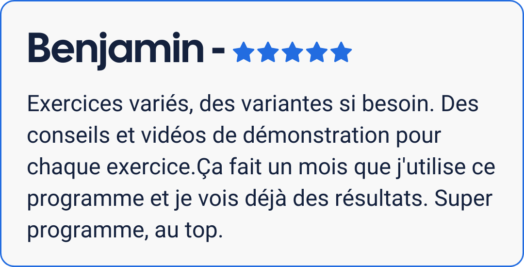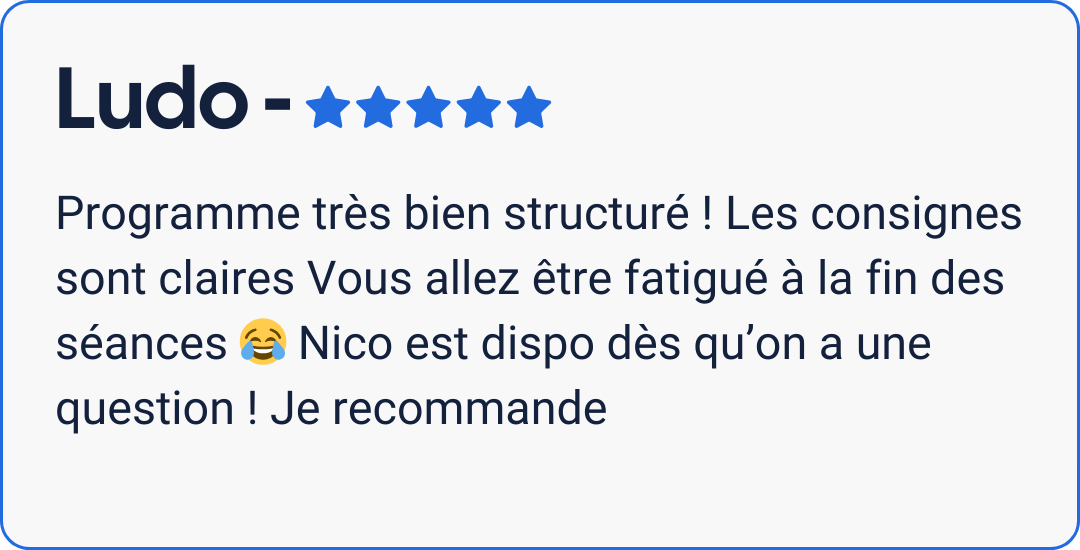 1 Google Sheet contenant le programme avec les exercices, les séries, les répétitions, l’intensité, les temps de repos, les conseils techniques, les vidéos d’exécution et des variantes d’exercices.